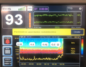 Lo curioso es que, con esa perfusión relativamente baja de dexmedetomidina, el BIS con espectrograma mostró un patrón delta muy marcado y un nivel de sedación profundo, como podéis ver en la imagen, en lugar del patrón de alfa spindles que esperaríamos ver con esas dosis.